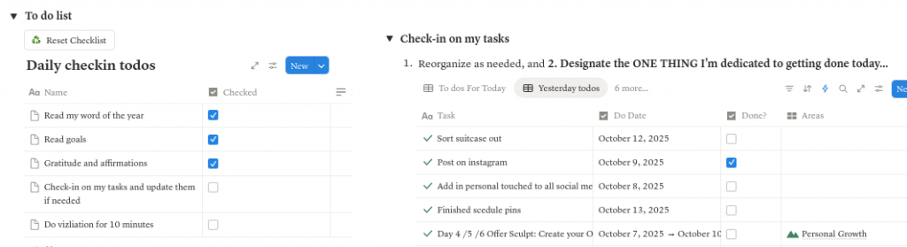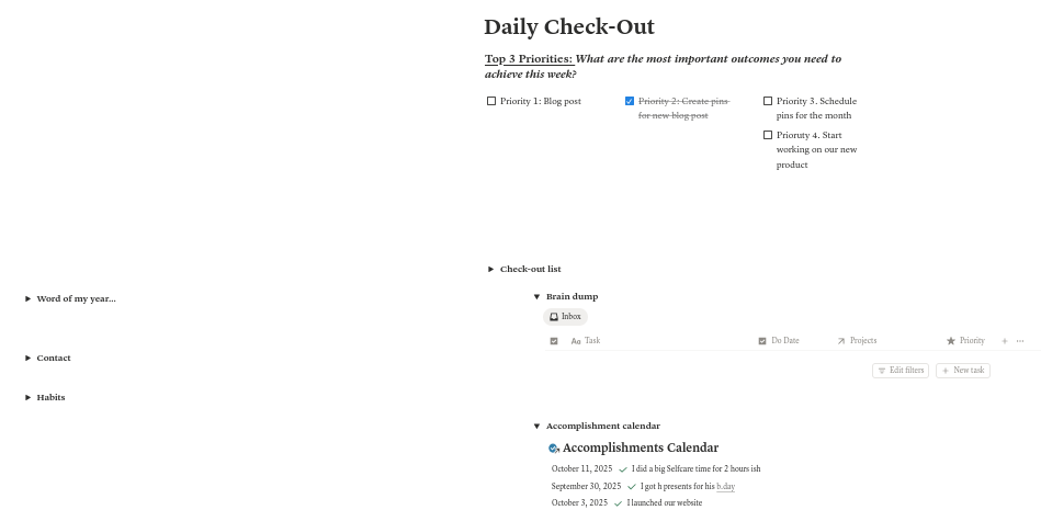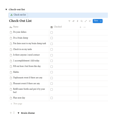 End your day with a daily check-out. Note your wins, acknowledge challenges, and do a brain dump to clear your mind. My routines live in Notion and are very flexible for me to move around.