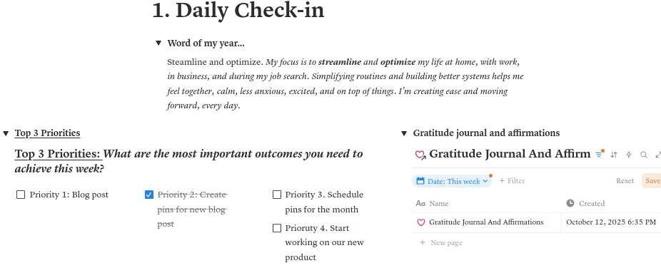 Notion is like my digital brain and safe calm space. My checklists, gratitude journals, priorities, and reflections all live there. Each time I open it, my mental load lightens because my worries are finally organized, not bouncing around in my head.